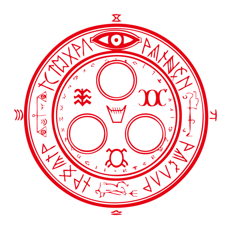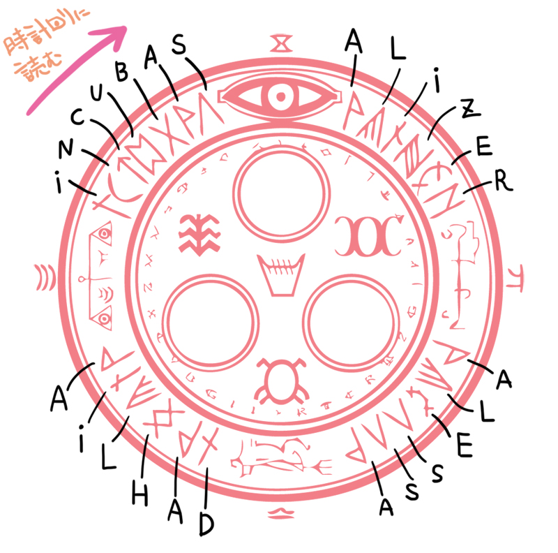 訳すことが出来るのは円の部分のルーンっぽい所。センターのゴキブリっぽい形の図形とかも実は文字なんですが、恐らく装飾以上の意味はないと思われます。