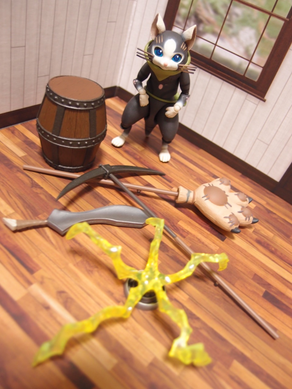 付属品としてメラルーの腰巾着、シビレ罠、つるはし、肉切ナイフ、武器のネコパンチ、樽。
