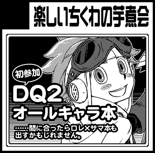てか告知もクソもDQ2で継続して出すかは分からんです。今の在庫を売りきったらまた一次の方のネタを煮詰めたいかなと思ってますんで、気が向いたら参加するかな〜ぐらいを予定してます。