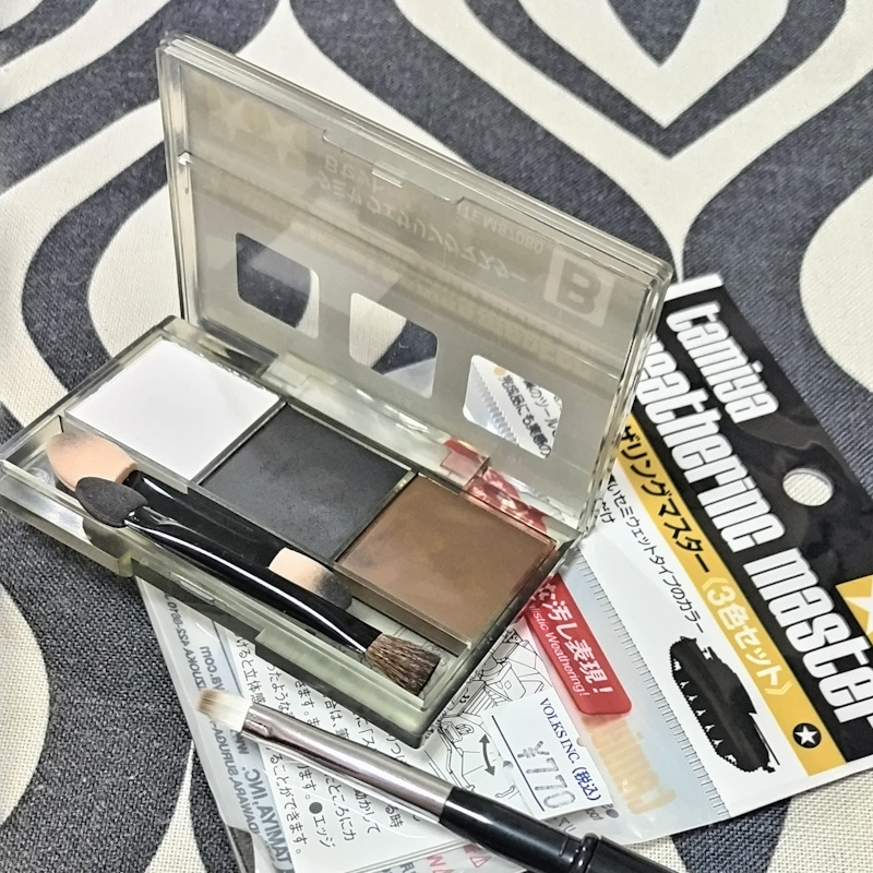 ちなみに、タミヤのウェザリングマスターはこういうアイシャドウケースもどきに入ってるけど、もし本当のアイシャドウパレットだったら白いハイライトにベースが濃い茶色、アイライン用の黒みたいに一見使えそうな割と使えない組み合わせである。単色使いならまあのぐらいのラインナップ。むしろアイラインかアイブロウにしか使えなくねって印象だな。