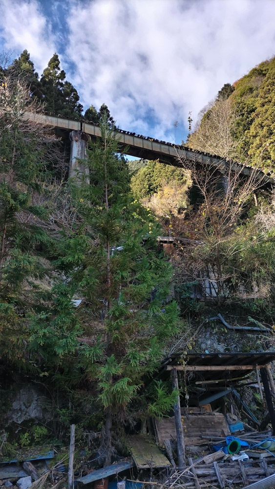 話を戻してルートの説明をすると、「むかしみち」って言ってる通りで旧青梅街道をそのままハイキングコースとして利用してる感じだった。川沿いの旧道で、ダム建設時の資材運搬用の廃線跡があったり、人の住んでる集落の中を進んだり、たまに廃集落の横を通ったり、オーバーハングの巨石を祀ってる神社があったり、街道らしい史跡が残ってたり、ちょこちょこ見る所があるハイキングコース。奥多摩駅と奥多摩湖を繋ぐ道でもあるので、駅側から踏破すると3〜4時間で湖に着くよ。