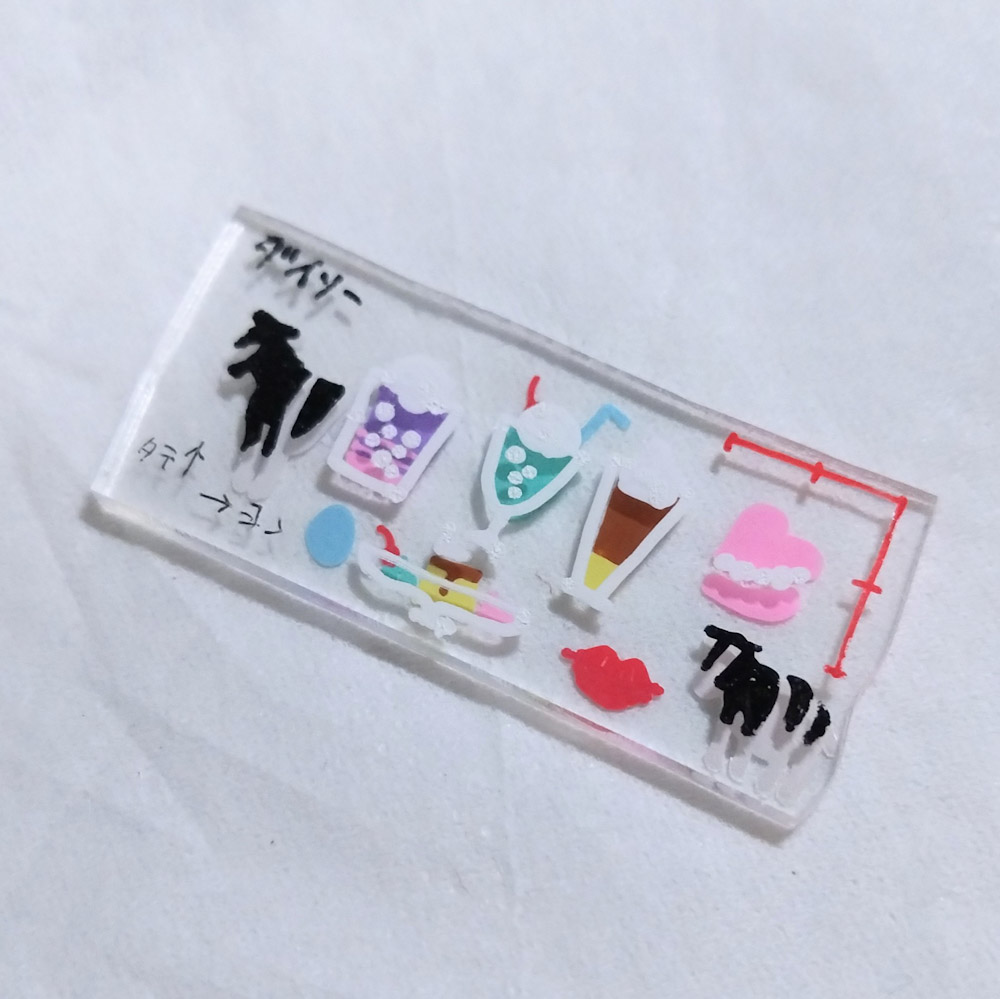 基本焼く前に塗ると圧縮(というか引き伸ばされる前に戻った姿が焼成後のプラバン)されてインクの色が濃くなるんだけど、印象よりはそこまで濃くなくて、むしろ程よいくらいかなって感じ。紫と緑はやや濃いけど許容内かな…。