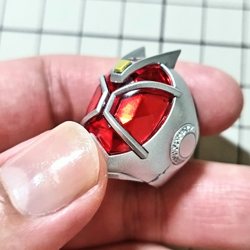 ベースの銀パーツに銀のミラーシールを貼って、上から赤のクリアパーツを嵌め込むことで、カボションカットの宝石やパビリオンの反射率を上げるために使うホイル加工を再現してるんですね。ギラギラとはいかないけどいい具合に反射するんで、ただのパチ組みでも適度に手が込んだフィギュアにみえるね。