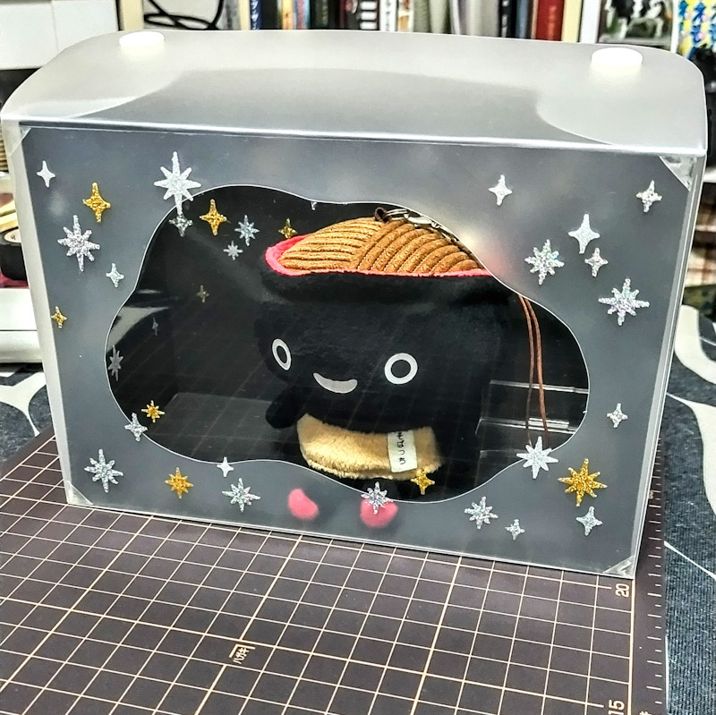 100均のショッピングバッグを改造した埃よけ。窓はプラバン、背景は42円で買ったA4用紙の星物語とロフトで買ったラメシール。中身はうちのそばっち。