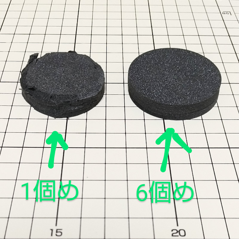 10mm厚に対して円カッターの刃渡りは5ミリ程度なんで、うまく表裏で同じ位置に当てないと抜けないんですよね。コツ掴んだら7割成功するようにはなったけど、1箇所だけボソボソになっちゃったから仕方なくボソボソ面を台紙側に貼り付けて見えないようにする感じ。