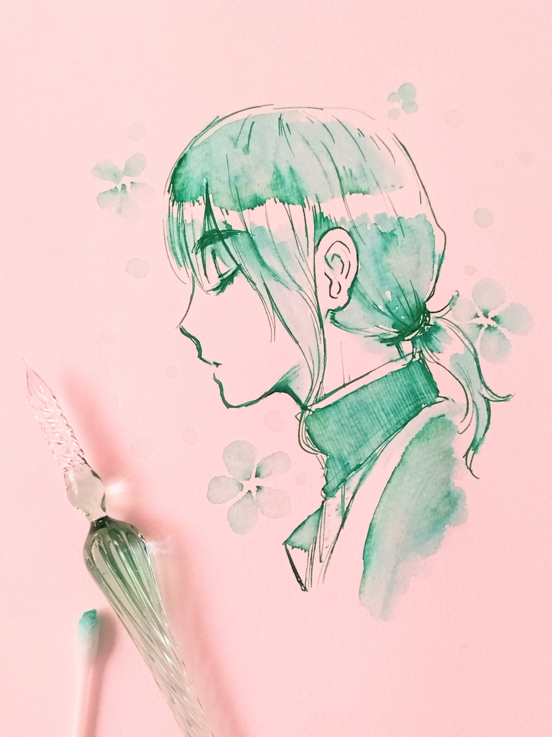 白い紙にエメラルドグリーンのインクで描いてスマホで色温度変えてピンクにしたのがこれ。何年か前に流行った色使い。