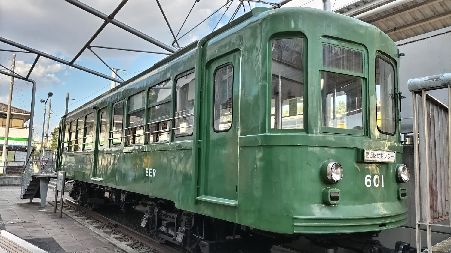オマケ。世田谷線の坂の宮駅に展示されてる江ノ電601号。元々は世田谷線デビューで、その後江ノ電になったらしいので展示は古巣のここらしい。
