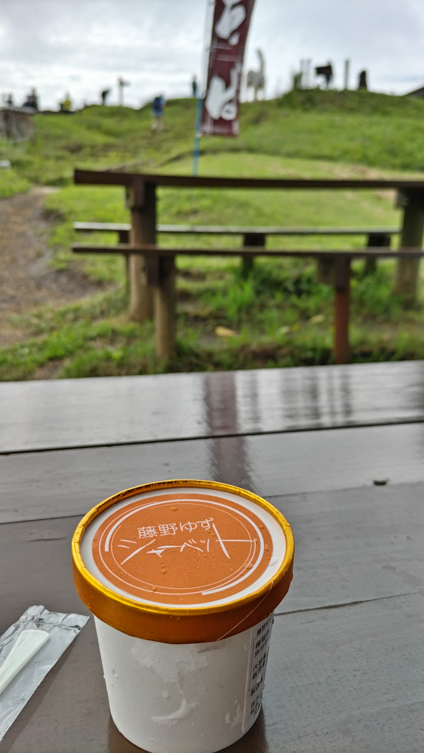 このゆずシャーベット旨いんだ。陣馬山の山頂の茶屋で食べられるんだけど、ゆずの苦味も少し効いてて、クールダウンに食うの最高なんだ。