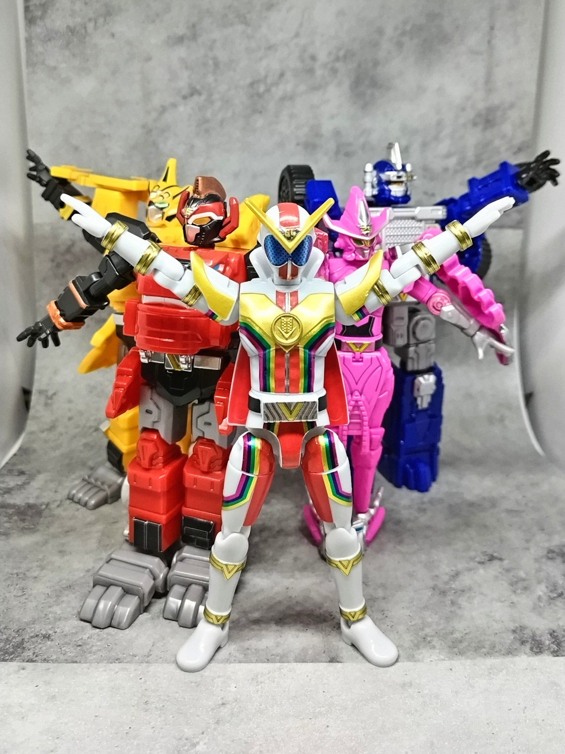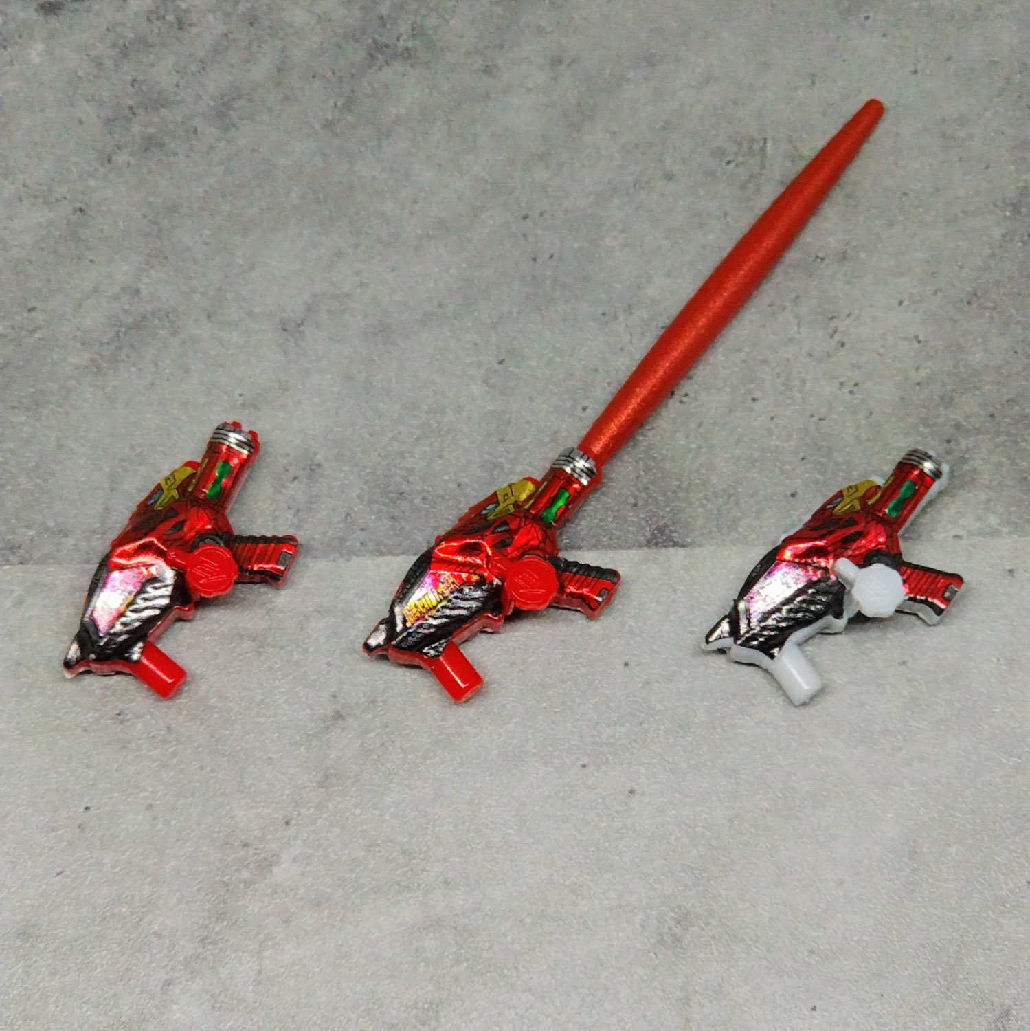 真ん中と左は番組が違うけど同じ演者で、赤いのはトッキュウジャーの主題歌歌ってた人(伊勢さん)がチェンジする、配信スピンオフに出てたちょいレアキャラ。後で本編にて頭に草を生やした状態の「ニンジンにされたゼンカイザー」ってのにも使われるので、そういう意味では全員が五色田介人ともいえる。