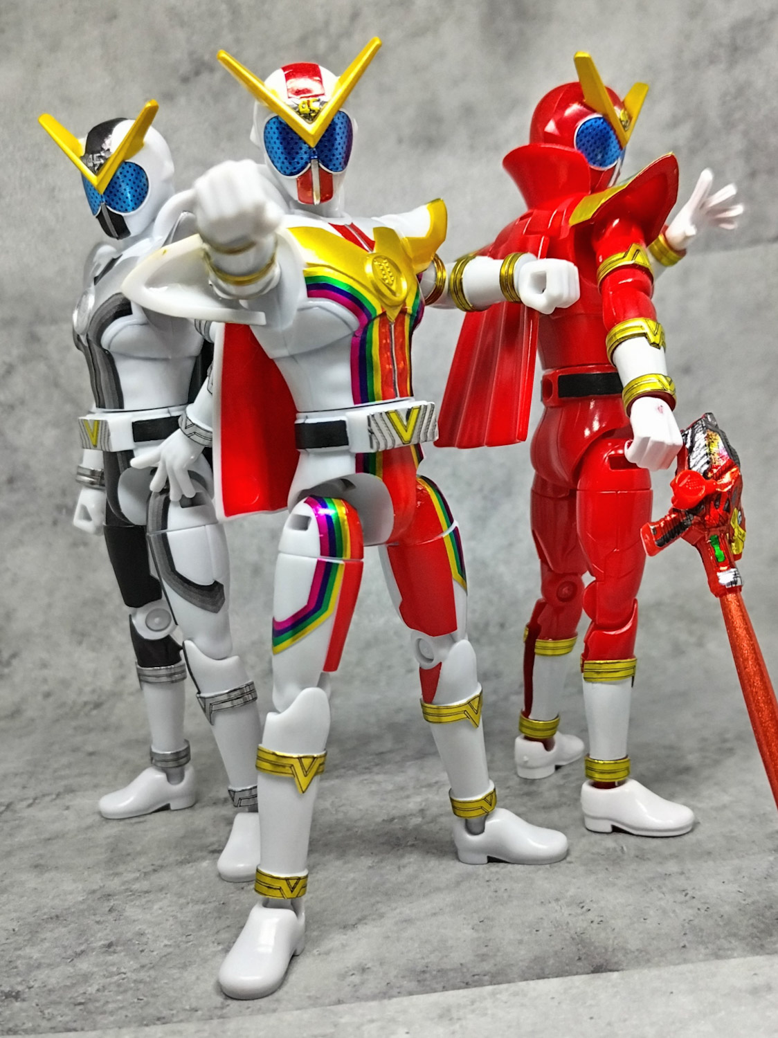 真ん中がゼンカイザー、向かって右がゼンカイレッド、左がドンブラのゼンカイザーブラック。
