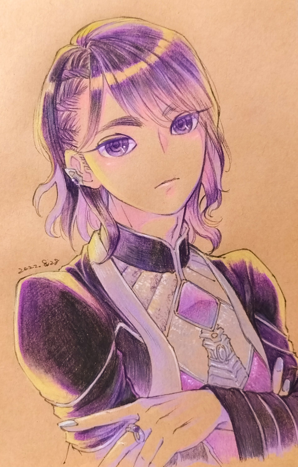 100均でクラフト紙のA6ノートが売っていて、色鉛筆で描くと適当な絵でもなんかいい感じに収まるからよく重ね塗りの練習がてら落書きをしてるんだけど、目が粗い紙なので細かいグラデを再現したいものに使うならよっぽどデカく描かないと駄目だわな。具体的に言うと瞳とか。