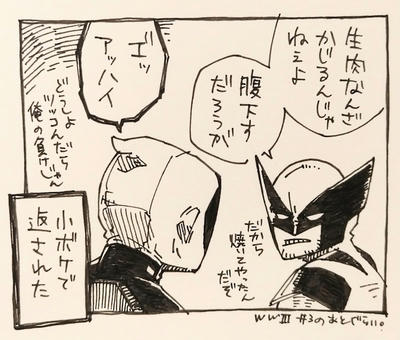 ジビエかぁって流れで頭に浮かんだのが「WWⅢ」の「ウサギ?アライグマ?」ってデップーの台詞で、普通にフランス料理とかで出るウサギはともかくアライグマの肉……?雑食だし硬そうだし不味そうなのにウサギと味間違えるって、死にかけの極限状態とはいえついに味覚もバカになったのか……