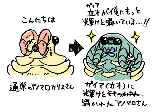 アノマロカリスというとカンブリア紀中期最大の生物ですな。歯…の印象より、顔の前方にある海老みたいな二本の触手の印象が強いなぁ。